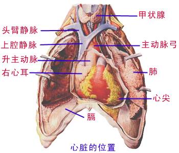 心位于胸腔中纵隔内。 Located in the heart of mediastinal chest. 2/3位于正中线左侧,1/3位于正中线右侧。 Located on the left side of the midline 2/3, 1/3 located on the right of midline.