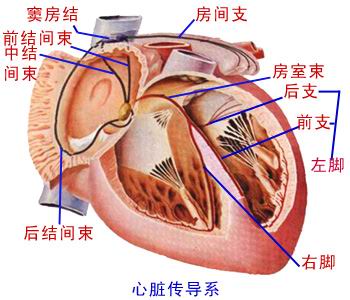 心的传导系是由特殊分化的心肌细胞组成。 Cardiac conduction system is differentiated by a special cardiac cells. 主要作用是产生并传导冲动,以维持心脏的正常节律。 The main role is to generate and conduct impulses, in order to maintain a normal heart rhythm. 主要包括窦房结、房室结、房室束及其分支。 Including sinus node, atrioventricular node, atrioventricular bundle and its branches.