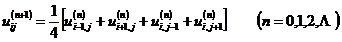[迭代法解差分方程]  在五点格式的差分方程中,任意取一组初值{uij},只要求它们在边界节点(i,j)上取以已知值(xi*,yj*),然后用逐次逼近法(也称迭代法)解五点格式: