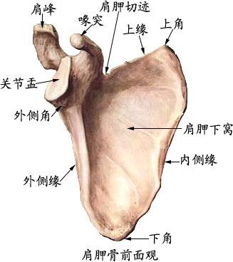 (1)肩胛骨:呈三角形,分两面、三缘、三角。后面有肩胛冈,末端延为肩峰,是肩部最高点。外侧角形成关节盂,参与肩关节构成。上角、下角分别平对第二、第七肋,是计数肋骨的标志。