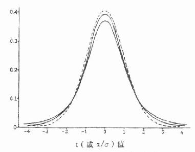 t分布也是左右对称,但在总体均数附近的面积较正态分布的少些,两端尾部的面积则比正态分布的多些。t分布曲线随自由度而不同(如图6.1)。随着自由度的增大,t分布逐渐接近正态分布,当自由度为无限大时,t分布成为正态分布。