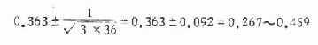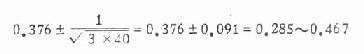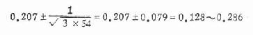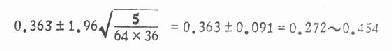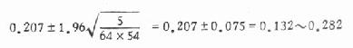 N=100.0 再计算各组的R值(加权平均参照单位值),用式(10.12),式中各符号结合本例含义是 式中∑为总和,f为各不同疗效者例数,R为与f同一疗效之标准组的R值。 标准组的R值应为0.5,可用以核对R值是否算对。 本题各组R计算如下: R辩中西=(4×0.006+39×0.067+93×0.256+2.4×0.694)/350=0.500 R西=(4×0.006+9×0.067+8×0.256+15×0.694)/36=0.363 R中=(13×0.006+20×0.067+11×0.256+10×0.694)/54=0.207 R辩中 =(2×0.006+9×0.067+13×0.256+16×0.694)/40=0.376 将各组R值与例数代入式10.14,得各组95%可信限如下: 辩中西