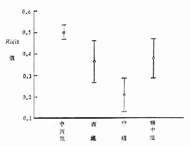 图10.1 四种疗法治疗溃疡病疗效的比较(Ridit分析) 根据以上四个区间及其示意图可以看出,辩中西组的区间与其它三组都不重叠,其它三组中西组和辩中组两区间有较大重叠,而与中组都是稍有重叠,在这种情况下可作较精确的分析,因为上述R值的标准差为