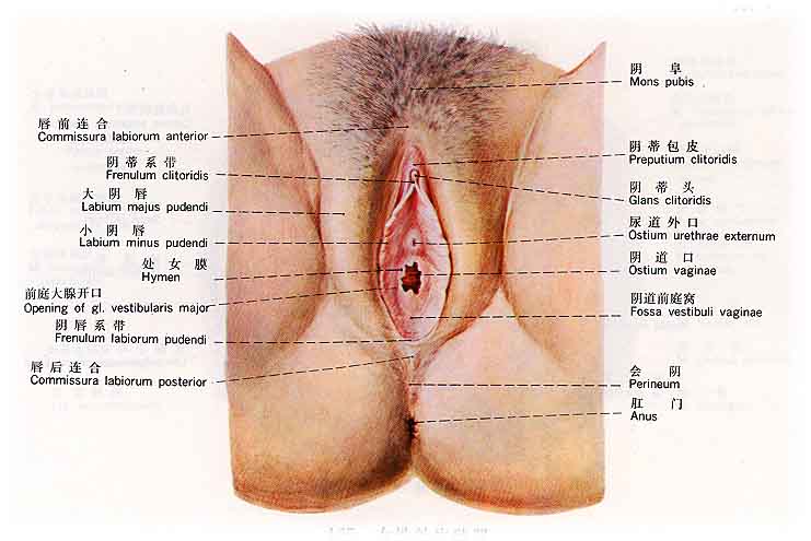 外生殖器为生殖器的外露部分,又称外阴(实图)。位于耻骨联合至会阴及两股内侧之间,包括阴阜、大小阴唇、阴蒂、前庭大腺、尿道口及阴道口等。