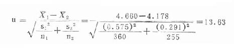 算得的u=13.63>2.58,P<0.01,按 α=0.05检验水准拒绝H0,接受H1,可认为该地男女红细胞数的均数不同,男性高于女性。