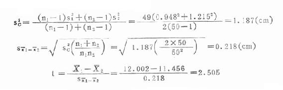 公式(19.10) 公式(19.11) 公式(19.12) 式中sx1-x2,为两样本均数之差的标准误,s2c为合并估计方差(combined estimate variance)。算得的统计量为t,按表19-4所示关系作出判断。 例19.7某医生统广西瑶族和侗族正常妇女骨盆X线测量资料各50例。骨盆入口前后径:瑶族的均数为12.002(cm),标准差0.948(cm),侗族相应的为11.456(cm)和1.215(cm)。问两族妇女的骨盆入口前后径是否有差别? H0: μ1=μ2 H1: μ1≠μ2 α=0.05 已知n1=n2=50,x1=12.002(cm),s1=0.948(cm); x2=11.456(cm),s2=1.215(cm).