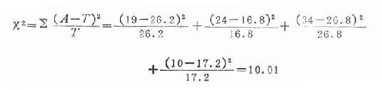 表内用虚线隔开的这四个数据是整个表中的基本资料,其余数据均由此推算出来;这四格资料表就专称四格表(fourfold table),或称2行2列表(2×2 contingency table)从该资料算出的两种疗法有效率分别为44.2%和77.3%,两者的差别可能是抽样误差所致,亦可能是两种治疗有效率(总体率)确有所不同。这里可通过x2检验来区别其差异有无统计学意义,检验的基本公式为: