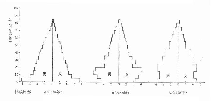 图24-1 1953~1990年我国三次人口普查资料按性别 年龄组成绘制的金字塔图 1.1953年(图A)人口性别年龄构成呈底大顶尖的金字塔形,5岁以下儿童占总人口的15.6%,反映了以前我国人口无节育情况下的自然增长情况;1982年(图B)底部内收呈壶状,5岁以下儿童比重锐减为9.2%,反映了推行计划生育后人口出生率降低;但图C底部又略向外突出,5岁以下儿童比重又回升为10.3%,值得注意。 2.性比例:三次调查结果男女比值波动于1.06:1到1.08:1之间。随着年龄增长,比值下降,60岁以后女性比男性多,80岁以上高龄的男女比值为1:2,这反映了人口构成的自然规律。 3.65岁以上老人占的比重:1953年为4.37%,1982年上升为4.91%,1990年再上升为5.458%。按国际标准以65岁以上老人占总人口4%以下者为“青年人口”,4~7%者为“壮年人口”,7%以上者为“老年人口”衡量,当前我国人口构成尚属“壮年人口”,有向“老年人口”转变的趋向。这是我国建国后卫生条件和保健措施明显改善,人均寿命延长的结果。另一方面又提示今后要重视老年卫生服务工作的开展。