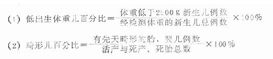 三、发育统计儿童和青少年身心发育水平,是衡量居民健康状况、研究环境对人群影响的重要指标;它与社会经济和营养条件关系密切,是评价医疗保健措施效果的重要方面。统计指标包括生长发育形态指标、生理功能指标和体能指标等方面。在妇幼卫生工作中还常用低出生体重儿百分比和畸形儿百分比等。所谓低出生体重儿(low birth weight infant)是指活产儿体重不满2500g者;低出生体重儿在婴儿期死亡率很高。例如纽约市1968年统计低出生体重儿在婴儿期死亡率达140.5‰,而2500~3000g者为12.1‰,3000g及以上者仅5.6~8.0‰。高山大气氧分压低,妊娠期母体缺氧可导致低出生体重儿的百分比增高,据西藏人民医院于1978年统计1767例新生儿体重,2500g以下者占28.24%,显著高于同年上海市报告为4.8%的水平,而与Lichby(1975)报告在海拔3050米高的原低出生体重儿占30.8%相近。以上两项指标计算式为: