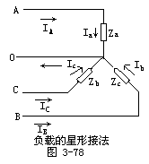【负载的星形接法】 三个负载的Za、Zb、Zc的一端连接在一起,成为负载中点O′,并接于三相电源的中线上,三个负载的另一端分别与三根端线(相线)A、B、C相接。如图3-78所示的接法就是负载的星形接法。在三相电路中,各相负载的电流称为“相电流”,如图3-78中的Ia、Ib、Ic。相电流正方向的规定与相电压的正方向一致。各端线中的电流称为“线电流”,如图中的IA、IB、IC。线电流的正方向规定为由电源到负载。负载作星形接法时,一条端线连接一个负载,从图3-78可以看出,线电流就是相电流,即