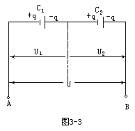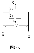 【电容器的并联】如图3-4所示为两个电容器并联,其中U表示两端A与B之间的电压(绝对值),q表示充电时流入电容器的总电量。