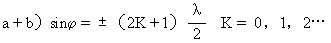 时,由各个狭缝所射出的光波都将各自地由于干涉而抵消,形成暗条纹。当然也就谈不上缝与缝之间的干涉作用,在这里即使符合明干涉条纹条件的也没有明条纹出现。由此可见在光栅衍射中,仅当j角满足(a+b)