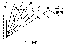 【全反射】 光由光密(即光在其中传播速度较小的)媒质射到光疏(即光在其中传播速度较大的)媒质的界面时,全部被反射回原媒质内的现象。光由光密媒质进入光疏媒质时,要离开法线折射,如图4-5所示。当入射角θ增加到某种情形(图中的e射线)时,折射线延表面进行,即折射角为90°,该入射角θc称为临界角。若入射角大于临界角,则无折射,全部光线均反回光密媒质(如图f、g射线),此现象称为全反射。当光线由光疏媒质射到光密媒质时,因为光线靠近法线而折射,故这时不会发生全反射。