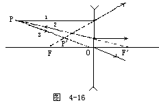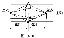 【凸透镜】 凸透镜是中央部分较厚的透镜。凸透镜分为双凸、平凸和凹凸(或正弯月形)等形式,如图4-9所示。薄凸透镜有会聚作用故又称聚光透镜,较厚的凸透镜则有望远、发散或会聚等作用,这与透镜的厚度有关。将平行光线(如阳光)平行于轴(凸透镜两个球面的球心的连线称为此透镜的主光轴)射入凸透镜,光在透镜的两面经过两次折射后,集中在轴上的一点,此点叫做凸透镜的焦点(记号为F),凸透镜在镜的两侧各有一焦点,如为薄透镜时,此两焦点至透镜中心的距离大致相等。凸透镜之焦距如图4-10所示,是指焦点到透镜中心的距离,通常以f表示。凸透镜球面半径越小,焦距越短,凸透镜可用于放大镜、老花眼及远视的人戴的眼镜、显微镜、望远镜的透镜等。