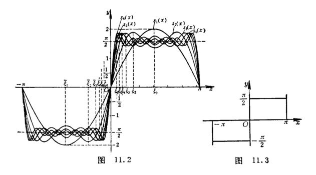 2 o If the function is piecewise monotonic in an open interval , and there are a finite number of discontinuities of the first kind in the interval, then (i) s m ( x ) converges at the continuous point x ; (ii) at the discontinuities of the first kind The point x 0 converges to ; (iii) at the endpoint of the interval, i.e., and on, equal to . ( Dirichlet's theorem )![]()