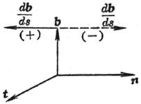 The sign of the torsion rate : when the point M moves along the positive direction of the curve, the vector is opposite to n , then the positive sign is taken, otherwise, the negative sign is taken (Figure ( b ) ) |