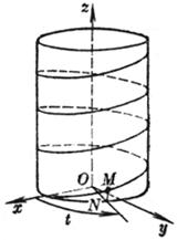 [ Cylinder helix ] A moving point rotates at a constant speed around a line and moves at a constant speed along the line, then the trajectory of this moving point is called a cylindrical helix (Figure 7.19 ), and its parameter equation is